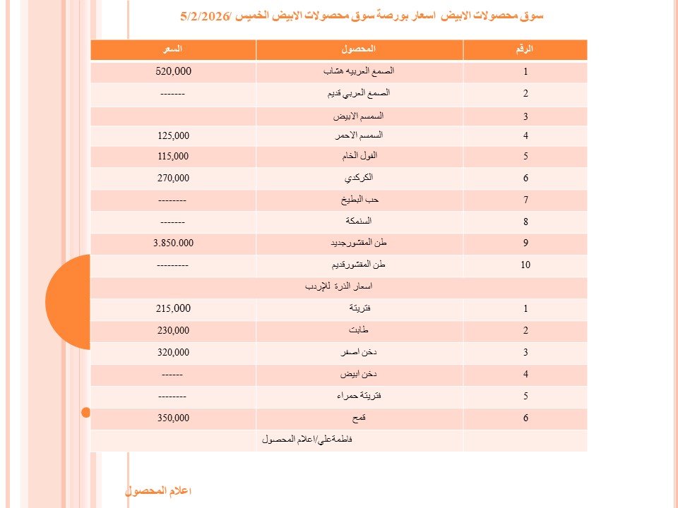 • أسعار بورصة سوق محصولات الأبيض ليوم الخميس الموافق الخامس من فبراير 2026م