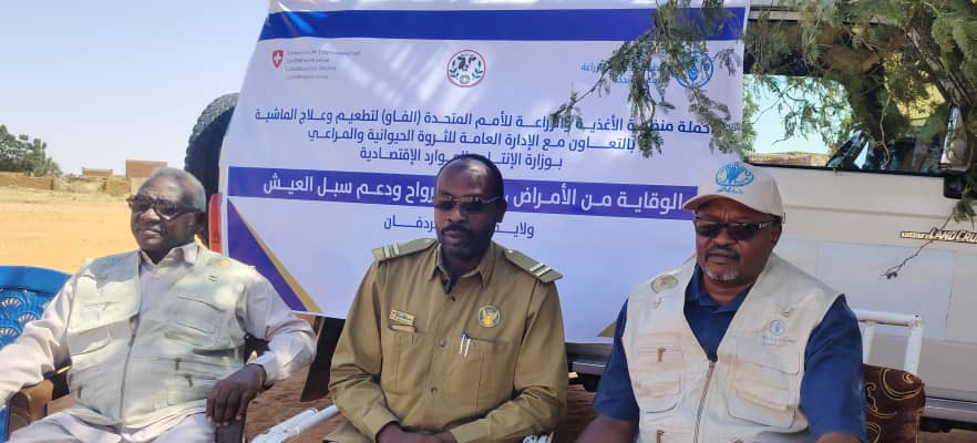 دشن مدير عام وزارة الإنتاج بالولاية الوزير المكلّف إبراهيم حامد محمد و نائب المدير التنفيذي لمحلية شيكان الأستاذ إبراهيم هدي محمد انطلاقة حملة منظمة الأغذية والزراعة للأمم المتحدة (الفاو) لتطعيم وعلاج الماشية بمنطقة خور طقت الدونكي والتي تأتي في إطار التعاون بين المنظمة والإدارة العامة للثروة الحيوانية والمراعي بوزارة الإنتاج والموارد الاقتصادية بالولاية