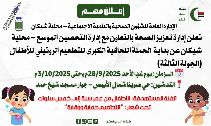 تعلن إدارة تعزيز الصحة بالتعاون مع إدارة التحصين الموسع محلية شيكان عن بداية الحملة اللحاقية الكبرى للتطعيم الروتيني للأطفال الجولة الثالثة يوم غدٍ الأحد الموافق 28/9/2025 وحتى 3/10/2025